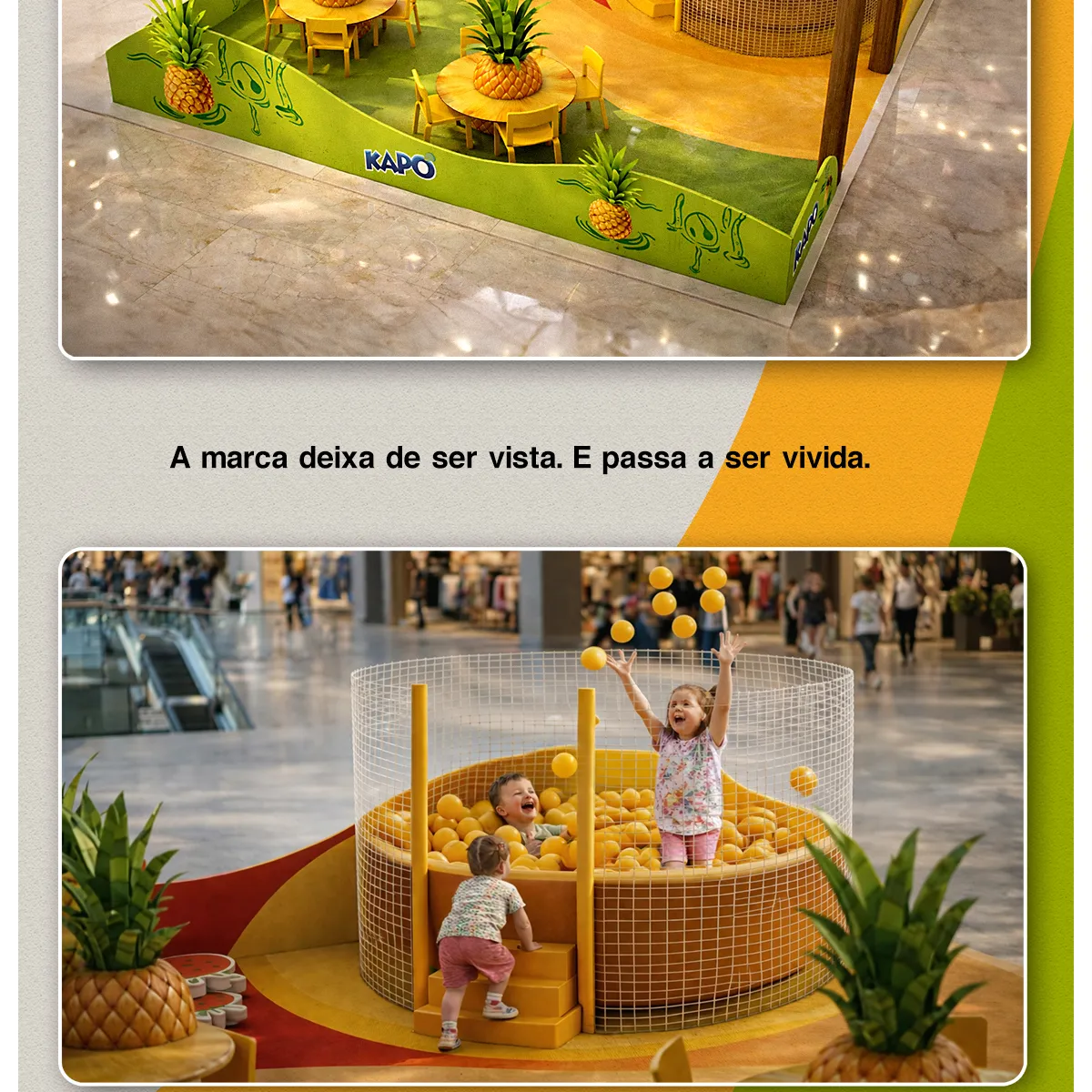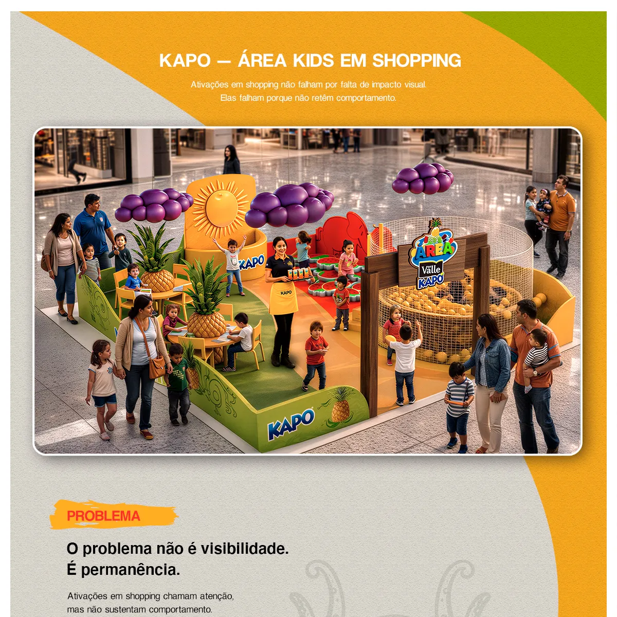 Em shoppings, onde estímulos competem a todo momento, visibilidade não garante experiência. Para Kapo, o projeto transforma o espaço em um sistema de permanência, organizando comportamento e convertendo interação em memória de marca.