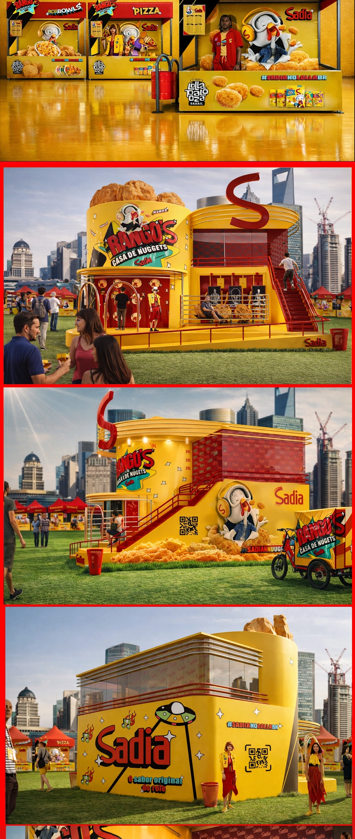No Lollapalooza, a Sadia precisava se destacar em um ambiente de alta densidade de estímulos, onde milhares de pessoas circulam entre palcos, ativações e experiências de marca. A convergência entre cenografia 3D e inteligência artificial permitiu simular volumetrias e fluxos de público ainda na fase de concepção, transformando o design do espaço em uma ferramenta estratégica de experiência e operação.